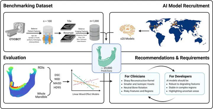 Despite the advances in automated medical image segmentation, AI models still underperform in various clinical settings, posing challenges for integration into real-world workflows. In this pre-registered prospective multicenter evaluation, we analyzed 20 state-of-the-art mandibular segmentation models across 19,218 segmentations of 1,000 clinically resampled CT/CBCT scans. Our results suggest that for a given model, segmentation accuracy can vary by up to 25% in Dice score as socio-technical factors such as voxel size, bone orientation, and patient conditions (e.g., osteosynthesis or pathology) shift from favorable to adverse. Higher sharpness, isotropic smaller voxels, and neutral orientation significantly improved results, while metallic osteosynthesis and anatomical complexity led to significant degradation. Our findings challenge the common view of AI models as “plug-and-play” tools and suggest evidence-based optimization recommendations for both clinicians and developers. This will in turn boost the integration of AI segmentation tools in routine healthcare.